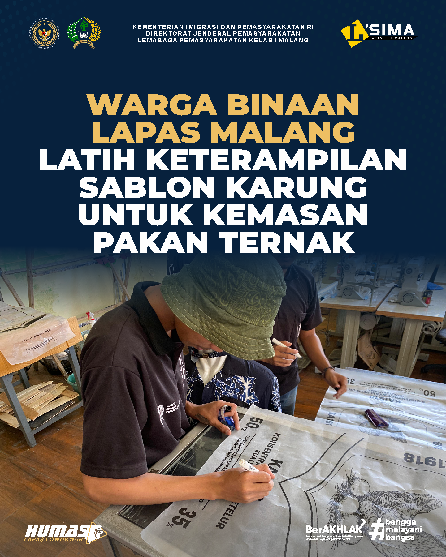 Malang – Lapas Kelas I Malang terus melanjutkan program pembinaan kemandirian melalui pelatihan keterampilan sablon bagi warga binaan yang digelar di bengkel kerja (13/10). Kali ini, materi pelatihan difokuskan pada teknik sablon karung yang nantinya akan dimanfaatkan sebagai kemasan produk pakan ternak hasil kegiatan kerja (giatja) warga binaan. Kegiatan ini menjadi bagian dari upaya Lapas Malang dalam meningkatkan nilai guna produk hasil pembinaan sekaligus memberikan pengalaman kerja yang aplikatif bagi peserta. Sekaligus tercipta kegiatan kerja tak hanya produktif namun juga berkesinambungan dan terintegrasi saling mendukung dari kegiatan satu dan lainnya.