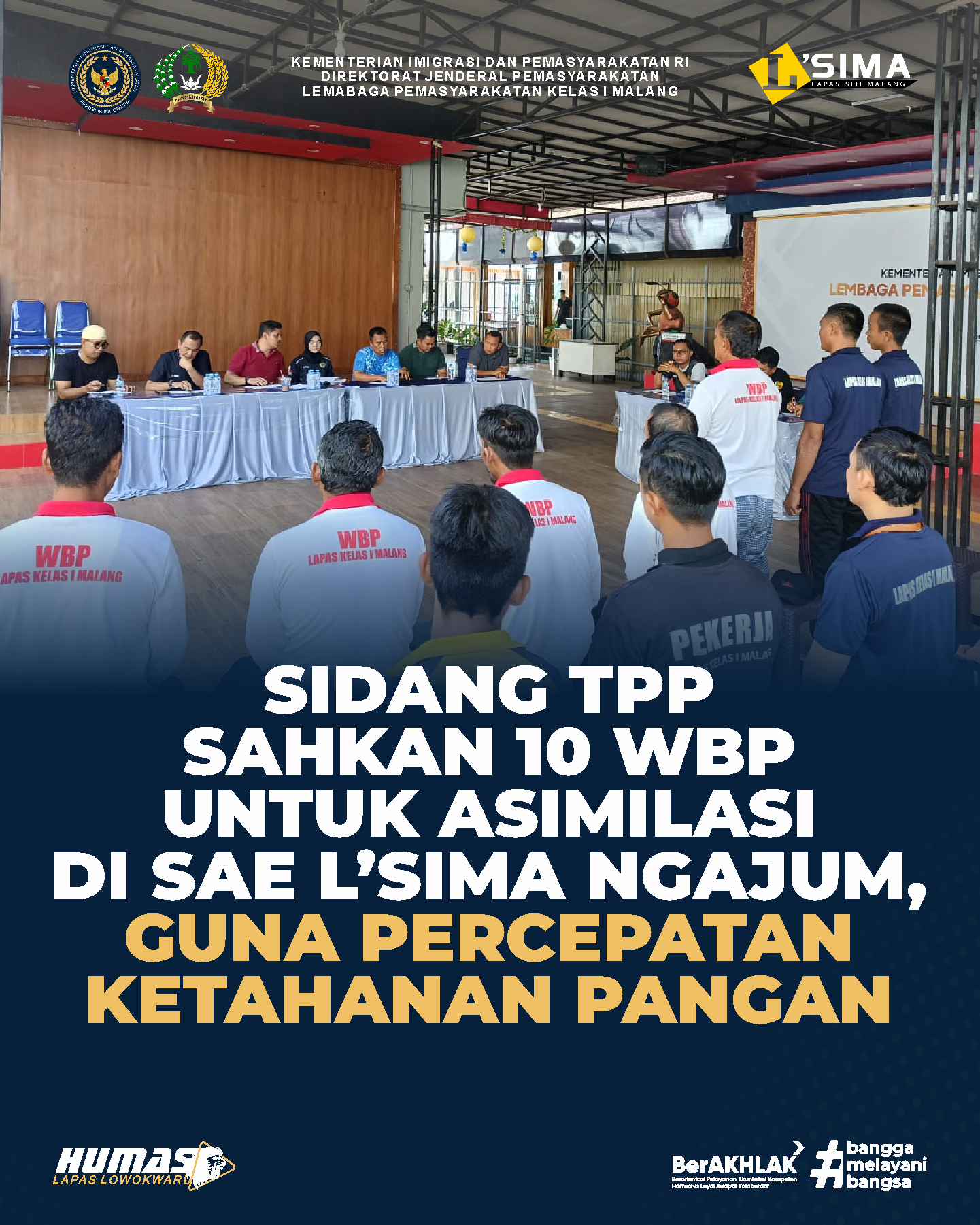 Malang – Lapas Kelas I Malang kembali menggelar Sidang Tim Pengamat Pemasyarakatan (TPP) sebagai bagian dari proses penentuan warga binaan yang akan melaksanakan program asimilasi di SAE L’SIMA Ngajum, Kabupaten Malang (17/10). Dalam sidang kali ini, terdapat 13 warga binaan yang diajukan, namun setelah melalui proses penilaian administratif dan substantif, hanya 10 orang yang dinyatakan memenuhi syarat untuk mengikuti program pembinaan kemandirian di luar tembok untuk belajar dan bekerja mendorong percepatan ketahanan pangan.