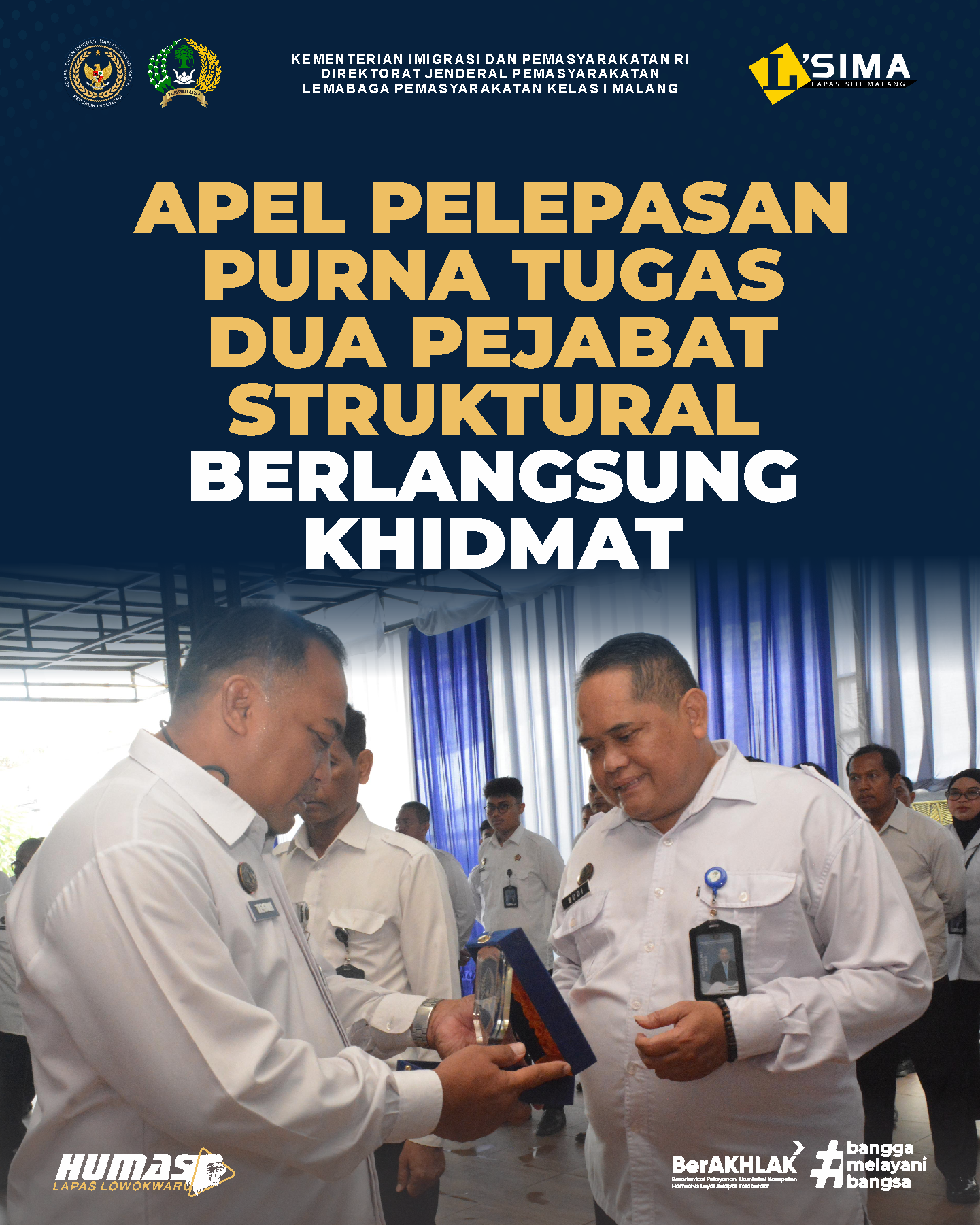 Malang – Pada pagi ini (30/10), Lapas Kelas I Malang menggelar apel pelepasan purna tugas bagi dua pejabat struktural, yakni Kepala Bidang Pembinaan, Budi Purwadi, dan Kepala Seksi Umum, Djoko Waluyo. Kegiatan berlangsung khidmat di Halaman Museum Pendjara Lowokwaroe dan dihadiri oleh seluruh jajaran petugas. Momen tersebut menjadi bentuk penghormatan atas dedikasi dan pengabdian panjang kedua pejabat selama bertugas di Lapas Kelas I Malang.