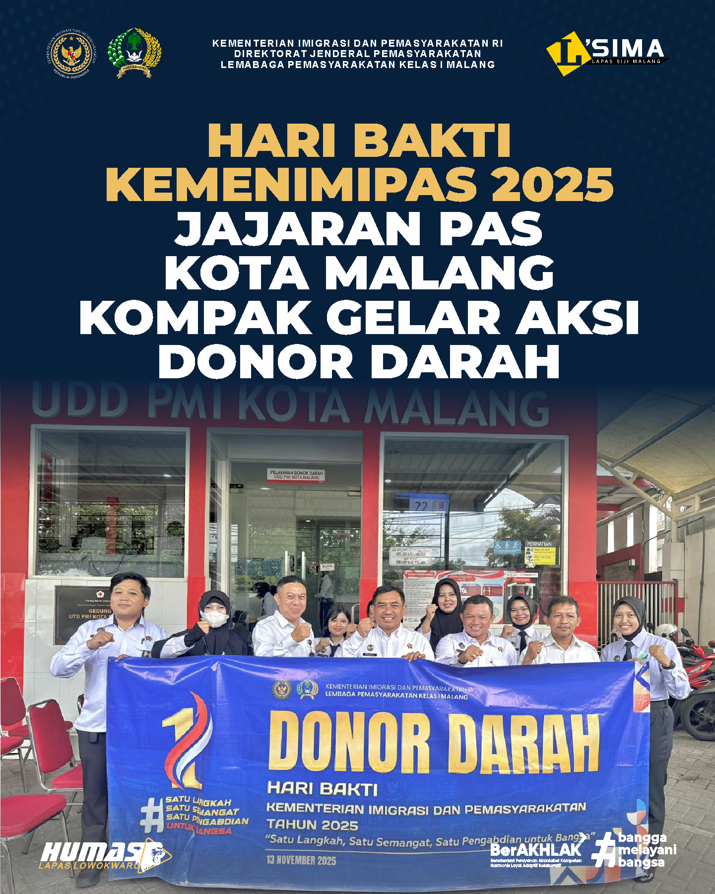 Malang – Dalam rangka memperingati Hari Bakti Kementerian Imigrasi dan Pemasyarakatan Tahun 2025, jajaran pegawai Lapas Kelas I Malang melaksanakan kegiatan donor darah di Unit Donor Darah (UDD) PMI Kota Malang, Jalan Buring No. 10, Malang(13/11). Kegiatan ini diikuti oleh puluhan petugas yang dengan sukarela sebagai bentuk kepedulian terhadap sesama. Tak hanya jajaran Lapas Malang, kegiatan ini juga diikuti oleh petugas dari Lembaga Pemasyarakatan Perempuan (LPP) Malang dan Balai Pemasyarakatan (Bapas) Malang, sehingga semakin menambah semangat kebersamaan antar unit pelaksana teknis pemasyarakatan di wilayah Malang Raya.