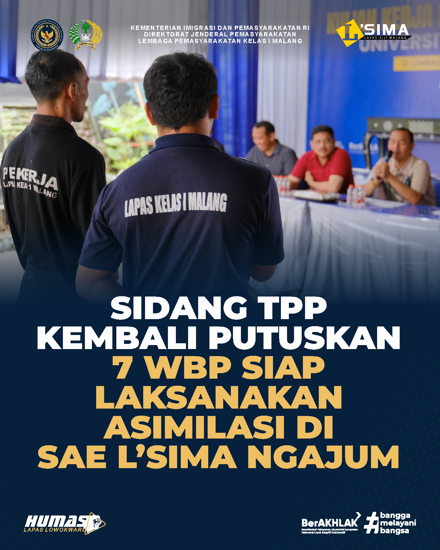 Malang — Lapas Kelas I Malang kembali melaksanakan Sidang Tim Pengamat Pemasyarakatan (TPP) bagi warga binaan yang akan mengikuti program asimilasi di Sarana Asimilasi dan Edukasi (SAE) L’SIMA Ngajum (14/11). Sidang yang dipimpin oleh Ketua TPP, dalam hal ini Kepala Bidang Pembinaan yang diwakili oleh Kepala Bidang Administrasi Keamanan dan Tata Tertib, berlangsung pada Jumat (14/11) dan diikuti oleh 11 warga binaan. Setelah melalui proses penilaian administratif dan substantif, TPP memutuskan bahwa 7 warga binaan memenuhi syarat untuk mengikuti asimilasi di SAE. Penetapan ini mempertimbangkan kedisiplinan, keuletan, serta keahlian dan minat mereka pada sektor agrikultur yang menjadi fokus utama kegiatan ketahanan pangan Lapas Malang.