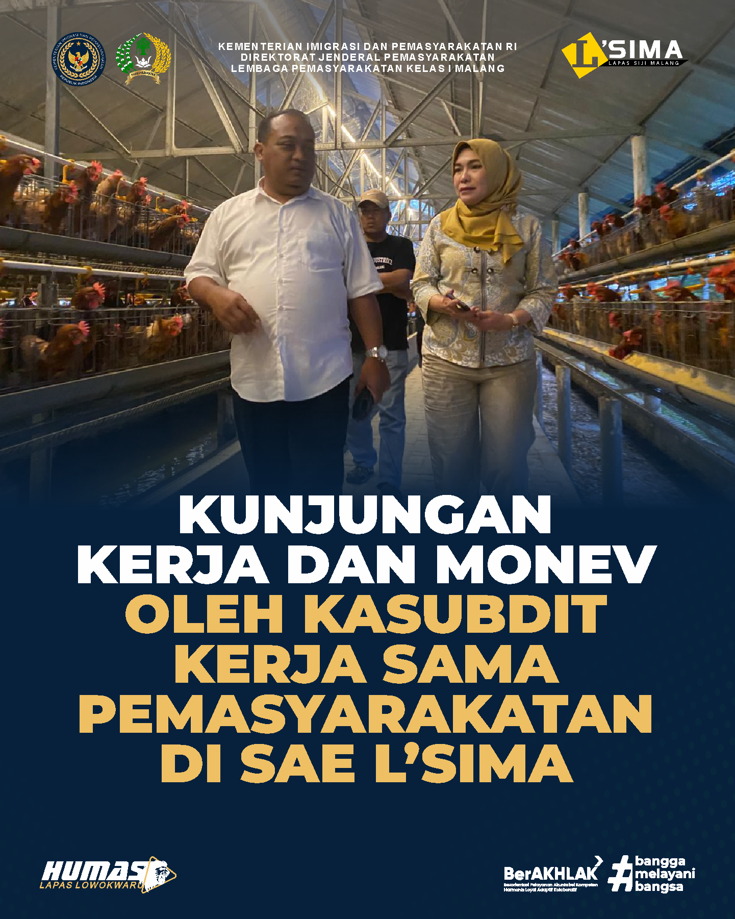 Malang-Kementerian Imigrasi dan Pemasyarakatan (Kemenimipas) melalui Direktorat Jenderal Pemasyarakatan melaksanakan kunjungan kerja dan monitoring–evaluasi di Sarana Asimilasi dan Edukasi (SAE) Lapas Kelas I Malang, Jumat (5/12). Kegiatan ini dilaksanakan oleh Kasubdit Kerja Sama Pemasyarakatan, Rika Aprianti, A.Md.IP., S.Sos., M.Si., yang hadir untuk meninjau langsung kemajuan program pembinaan kemandirian. Kehadirannya disambut oleh Kalapas Kelas I Malang beserta jajaran yang mendampingi sepanjang kegiatan. Para mitra investor pengelolaan SAE turut hadir sebagai bentuk dukungan terhadap keberlanjutan pengembangan unit kegiatan produktif. Kunjungan ini menjadi momentum penting dalam memperkuat sinergi antara lapas, pemerintah, dan mitra.