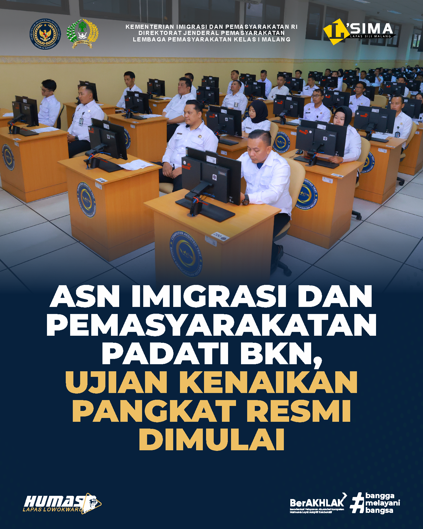 Pada sesi kedua, Kepala Kantor Wilayah Ditjenpas Jawa Timur, Kadiyono, hadir memberikan sambutan, meninjau pelaksanaan ujian, serta memastikan tidak ada kendala teknis yang menghambat proses. Beliau menekankan pentingnya fokus, kedisiplinan, dan integritas selama mengerjakan ujian sebagai wujud komitmen profesional ASN. Kalapas Malang, Teguh Pamuji, turut menyampaikan dukungan bagi jajaran Lapas Malang yang mengikuti ujian tersebut dan berharap hasil terbaik bagi peserta. “Saya berharap seluruh pegawai L’SIMA yang mengikuti UPKP dan Ujian Dinas dapat menuntaskan ujian dengan baik dan segera memperoleh penyesuaian ijazah sesuai harapan,” ujar beliau. Secara keseluruhan, pelaksanaan UPKP dan Ujian Dinas berjalan lancar dan menjadi bagian penting dalam upaya membentuk SDM unggul di lingkungan Kementerian.
