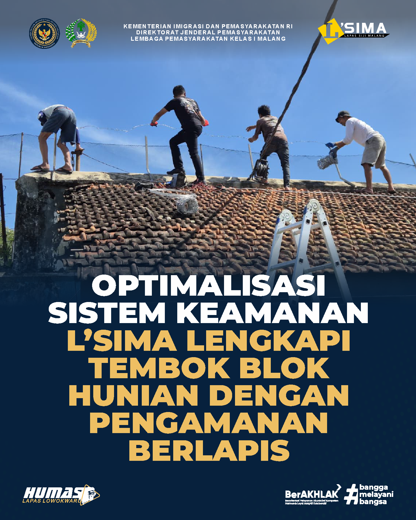 Malang - Jajaran Keamanan dan Tata Tertib Lapas Kelas I Malang melaksanakan kegiatan perbaikan serta penambahan alat pengamanan berupa kawat berduri di area atap dan tembok kedua blok hunian Bukit Barisan. Kegiatan ini dilaksanakan sebagai langkah penguatan sistem pengamanan meskipun struktur tembok dan atap di area tersebut telah memiliki ketinggian yang memadai. (23/12) Penambahan kawat berduri dinilai penting untuk meningkatkan upaya pencegahan terhadap potensi gangguan keamanan dan ketertiban. Langkah ini sekaligus menjadi bagian dari pemeliharaan sarana pengamanan agar tetap berfungsi optimal. Seluruh proses perbaikan dilakukan secara terencana dan berkelanjutan.