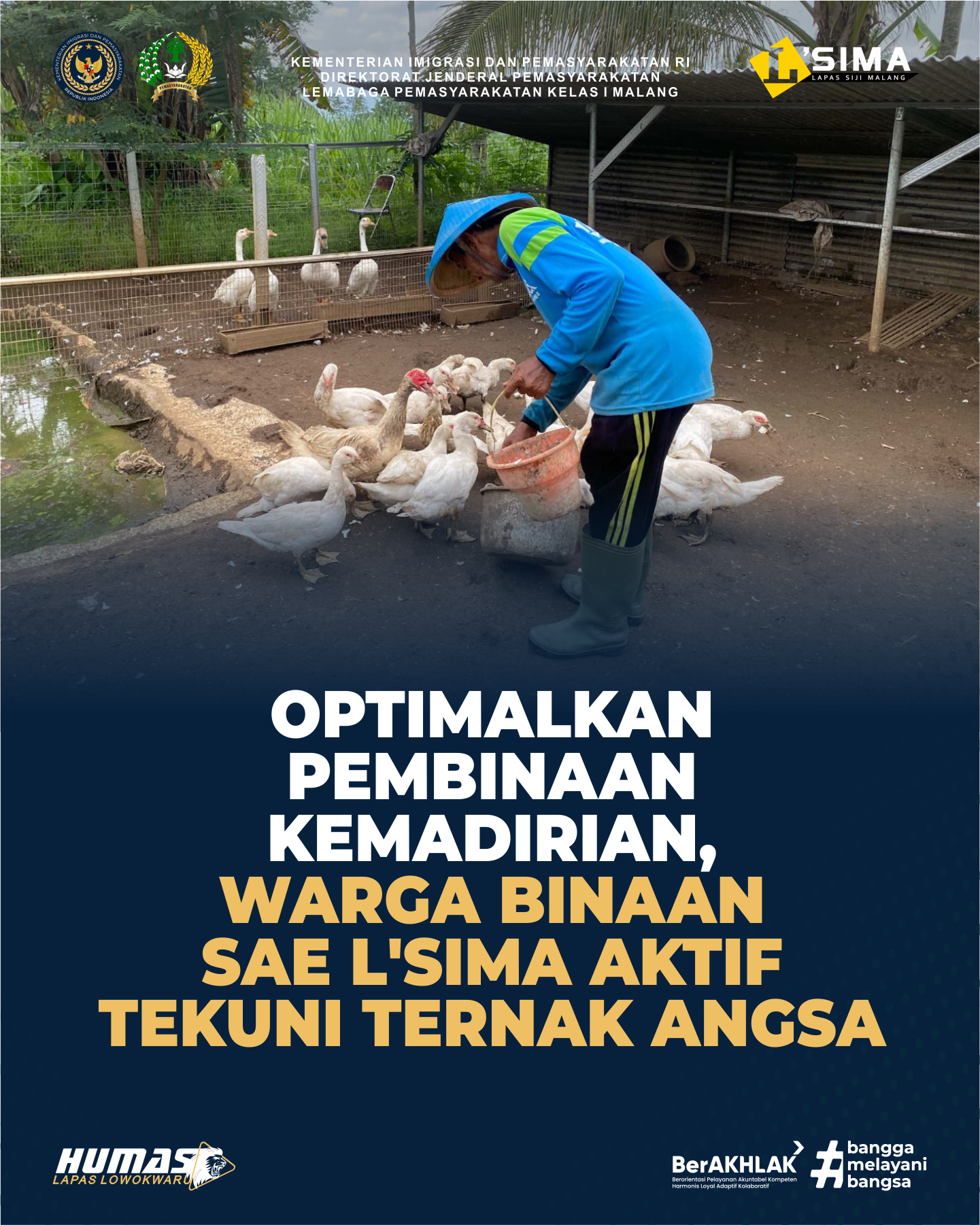Melalui kegiatan beternak angsa ini, WBP dibekali keterampilan praktis di bidang peternakan unggas. Penerapan pola pemeliharaan yang baik, mulai dari manajemen pakan hingga kebersihan kandang, menjadi bagian penting dalam proses pembelajaran. Kegiatan ini juga melatih kedisiplinan, tanggung jawab, serta kerja sama antar WBP. Program beternak angsa di SAE Lapas Kelas I Malang tidak hanya bertujuan untuk meningkatkan produktivitas, tetapi juga sebagai sarana edukasi dan pembentukan karakter. Diharapkan, keterampilan yang diperoleh dapat menjadi bekal bagi WBP setelah kembali ke tengah masyarakat.