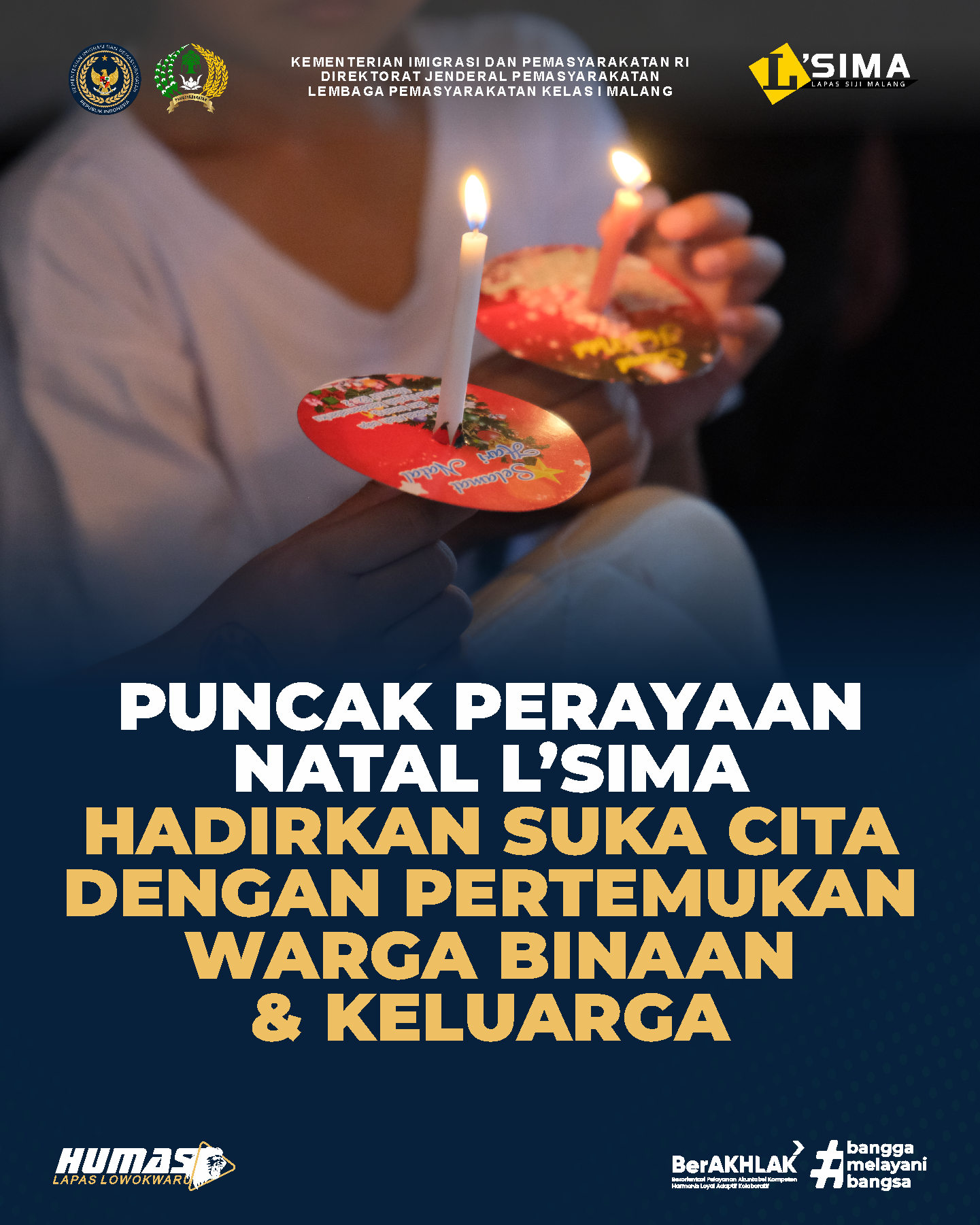 Malang - Lembaga Pemasyarakatan (Lapas) Kelas I Malang menggelar kegiatan puncak Perayaan Natal bersama Warga Binaan, Selasa (13/01), yang dilaksanakan di Aula Kunjungan Lapas Kelas I Malang. Kegiatan ini secara khusus turut mengundang keluarga Warga Binaan untuk hadir dan merayakan Natal serta mengikuti ibadah bersama. Perayaan Natal kali ini mengusung tema “Allah Datang Menyelamatkan Keluarga” sebagai refleksi penguatan iman dan ikatan kekeluargaan. Hadir dalam kegiatan tersebut perwakilan Kementerian Agama, para pastur, serta rohaniawan dari berbagai gereja di Kota Malang. Suasana kebersamaan dan kekeluargaan terasa kuat sejak awal hingga akhir kegiatan.