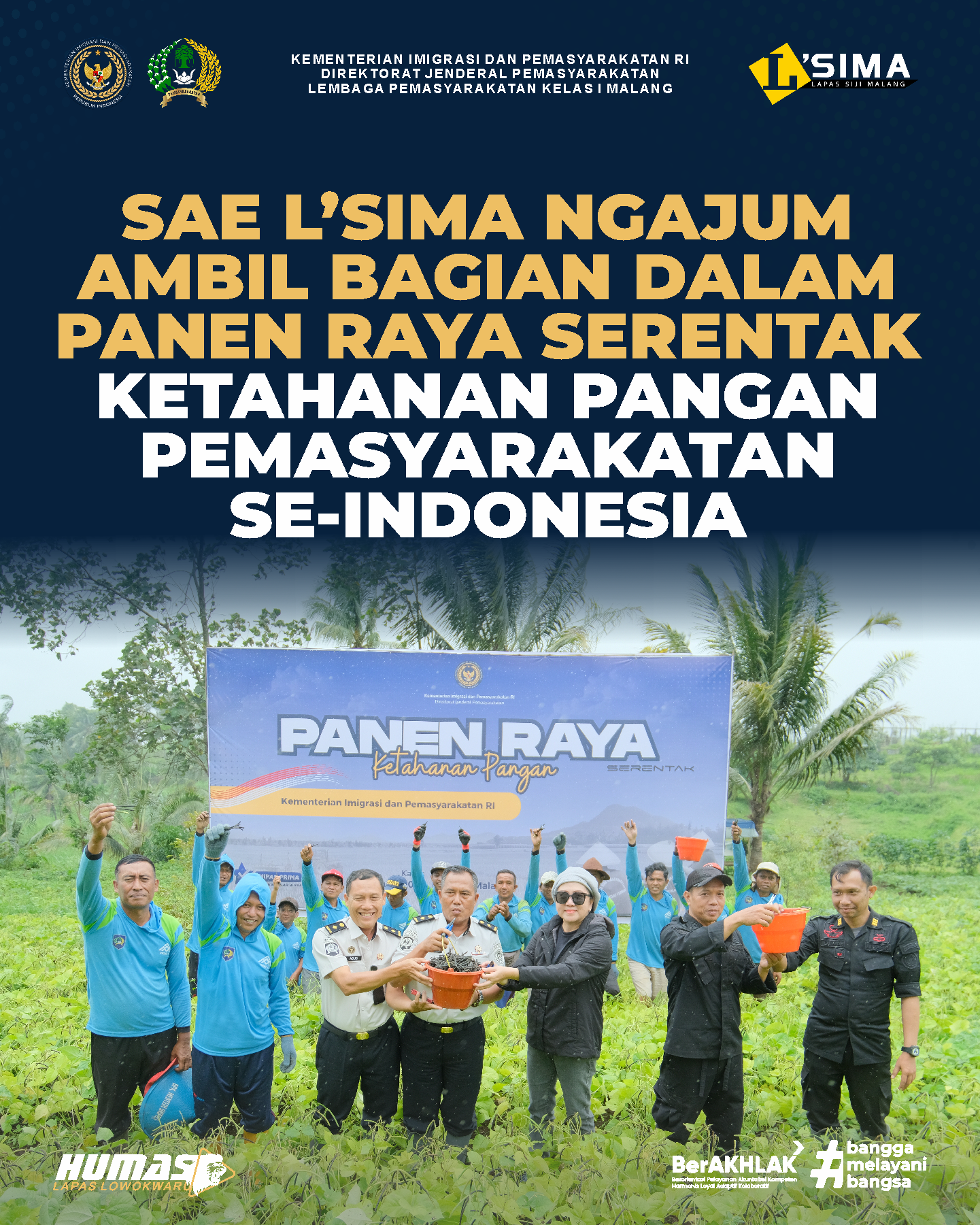 Sementara itu, Kepala Lapas Kelas I Malang, Teguh Pamuji, turut mengikuti kegiatan panen raya serentak secara daring dari Lapas Banyuwangi, bersama Kepala Kantor Wilayah Direktorat Jenderal Pemasyarakatan Jawa Timur serta jajaran Pemasyarakatan Jawa Timur. Beliau menyampaikan dukungan penuh terhadap pelaksanaan panen raya ketahanan pangan ini dan mengapresiasi peran aktif SAE L’SIMA Ngajum dalam mendukung program nasional tersebut. “Kegiatan ini tidak hanya menjadi wujud pembinaan kemandirian warga binaan, tetapi juga bentuk kepedulian sosial Pemasyarakatan terhadap sesama. Seluruh hasil panen, baik dalam bentuk bahan pangan maupun hasil pendapatan panen, dikumpulkan ke pusat dan akan disalurkan untuk membantu saudara-saudara kita yang sedang dilanda bencana alam di Sumatra,” ujar beliau. Beliau berharap hasil panen tersebut dapat memberikan manfaat nyata dan program pembinaan kemandirian warga binaan terus berjalan optimal, berkelanjutan, serta berdampak positif bagi masyarakat luas.