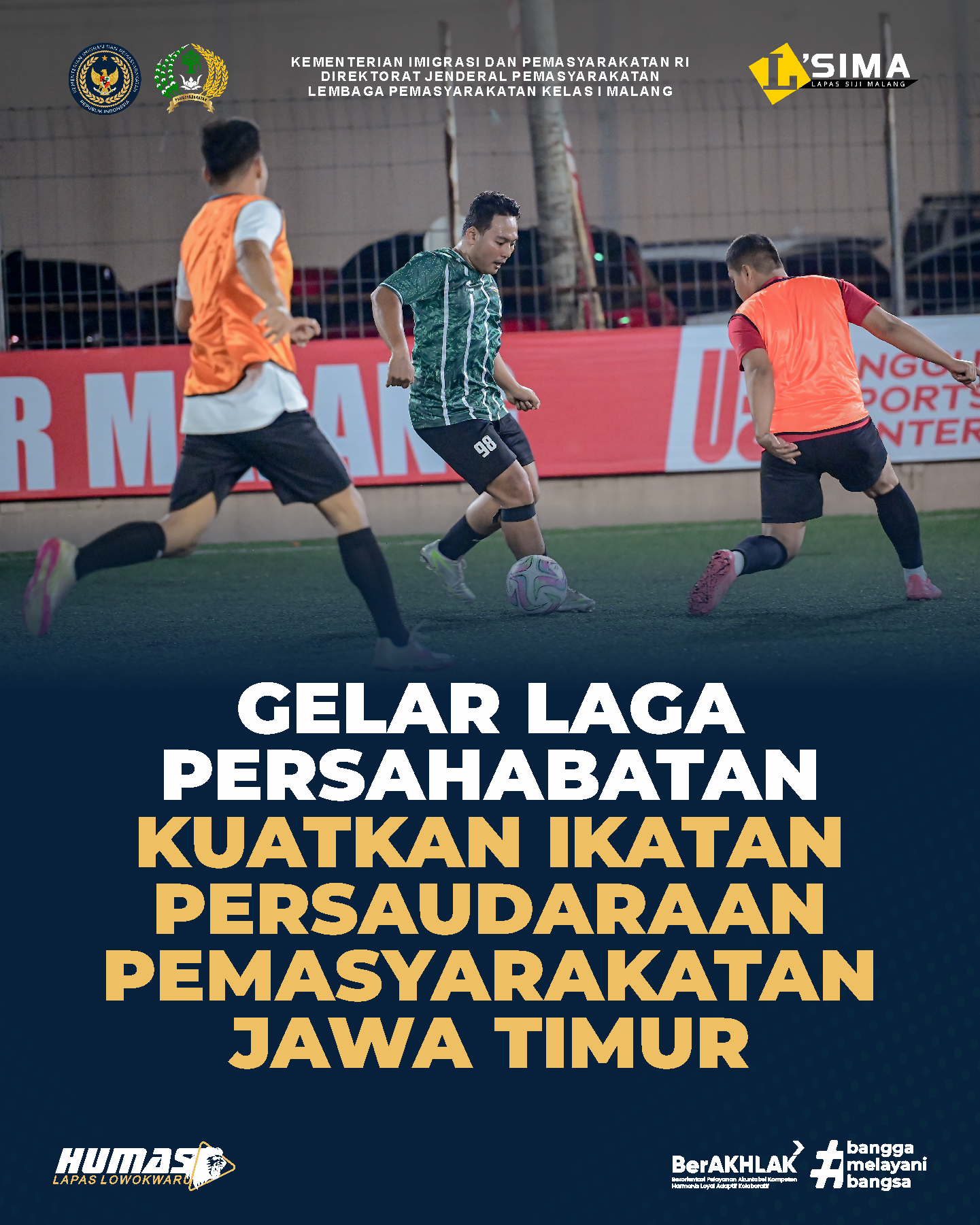 Malang - Tim sepak bola Lapas Kelas I Malang, Aranjep FC, melaksanakan pertandingan persahabatan melawan tim sepak bola Kantor Wilayah Direktorat Jenderal Pemasyarakatan Jawa Timur pada Kamis (15/01). Pertandingan tersebut digelar di Unggul Sport Center Malang dengan format Mini Soccer. Kegiatan ini berlangsung dalam suasana penuh keakraban dan kebersamaan antarpetugas Pemasyarakatan. Sejak awal laga, kedua tim menampilkan permainan sportif dan saling menghormati. Atmosfer pertandingan mencerminkan semangat sinergi yang kuat antarjajaran.