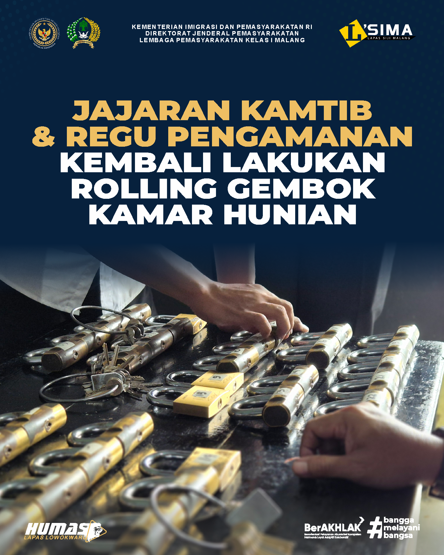 Malang - Kepala Seksi Keamanan Lapas Kelas I Malang bersama jajaran keamanan serta dibantu regu pengamanan melaksanakan kegiatan rolling atau tukar acak gembok blok hunian, Selasa (21/01). Kegiatan ini merupakan langkah preventif guna mencegah potensi gangguan keamanan dan ketertiban di lingkungan lapas. Rolling gembok dilakukan sebagai bagian dari penguatan sistem pengamanan kamar hunian agar tidak mudah dipetakan. Pelaksanaan kegiatan berjalan terkoordinasi dengan pengawasan langsung petugas keamanan. Seluruh tahapan dilaksanakan sesuai prosedur pengamanan yang berlaku. Situasi selama kegiatan berlangsung terpantau aman dan kondusif.