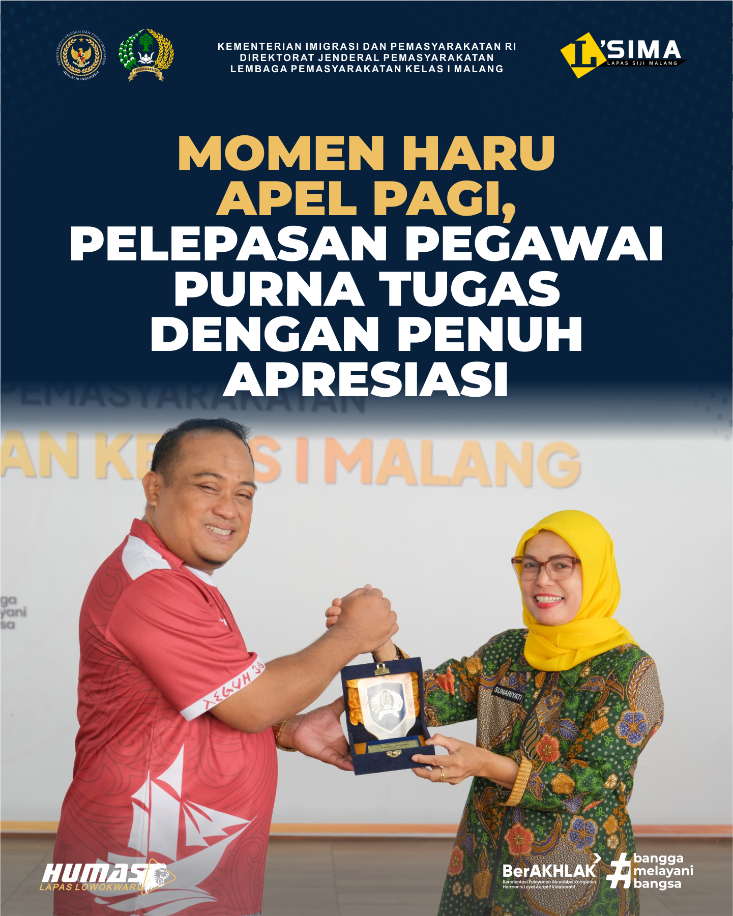 Malang - Lembaga Pemasyarakatan Kelas I Malang menggelar apel pegawai yang dirangkaikan dengan acara pelepasan pegawai purna tugas. (30/01) Apel tersebut dilaksanakan sebagai bentuk penghormatan dan apresiasi kepada Ibu Sunariyati atau yang akrab disapa Bu Ambon atas pengabdian beliau selama bertugas. Kegiatan berlangsung dengan khidmat dan diikuti oleh seluruh jajaran pejabat struktural serta pegawai. Suasana apel terasa emosional namun tetap penuh rasa kebersamaan. Momen ini menjadi simbol pelepasan sekaligus ungkapan terima kasih institusi kepada pegawai yang telah menyelesaikan masa baktinya dengan baik.