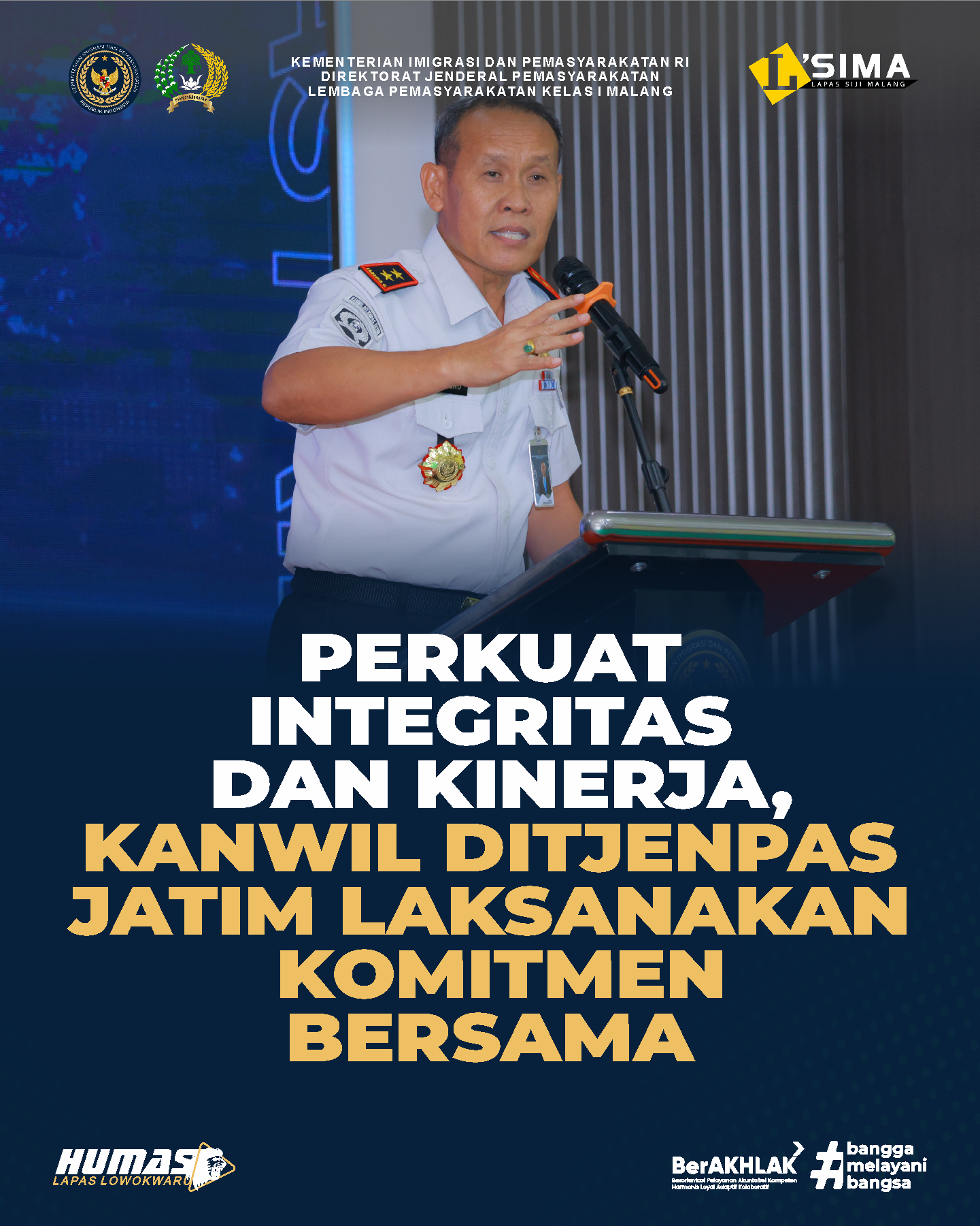 Malang - Lapas Kelas I Malang turut berpartisipasi aktif dalam kegiatan Penandatanganan Komitmen Bersama yang diselenggarakan Kantor Wilayah Direktorat Jenderal Pemasyarakatan Jawa Timur di Aula Lapas Kelas I Surabaya, Kabupaten Sidoarjo, Selasa (3/2). Kegiatan ini dihadiri langsung oleh Kepala Lapas Kelas I Malang, Teguh Pamuji, bersama seluruh Kepala Satuan Kerja Pemasyarakatan se-Jawa Timur. Penandatanganan komitmen bersama tersebut menjadi wujud keseriusan jajaran pemasyarakatan dalam memperkuat integritas, profesionalitas, serta mendukung reformasi birokrasi secara berkelanjutan. Momentum ini juga menegaskan kesatuan langkah antar-satuan kerja dalam meningkatkan kualitas layanan pemasyarakatan.