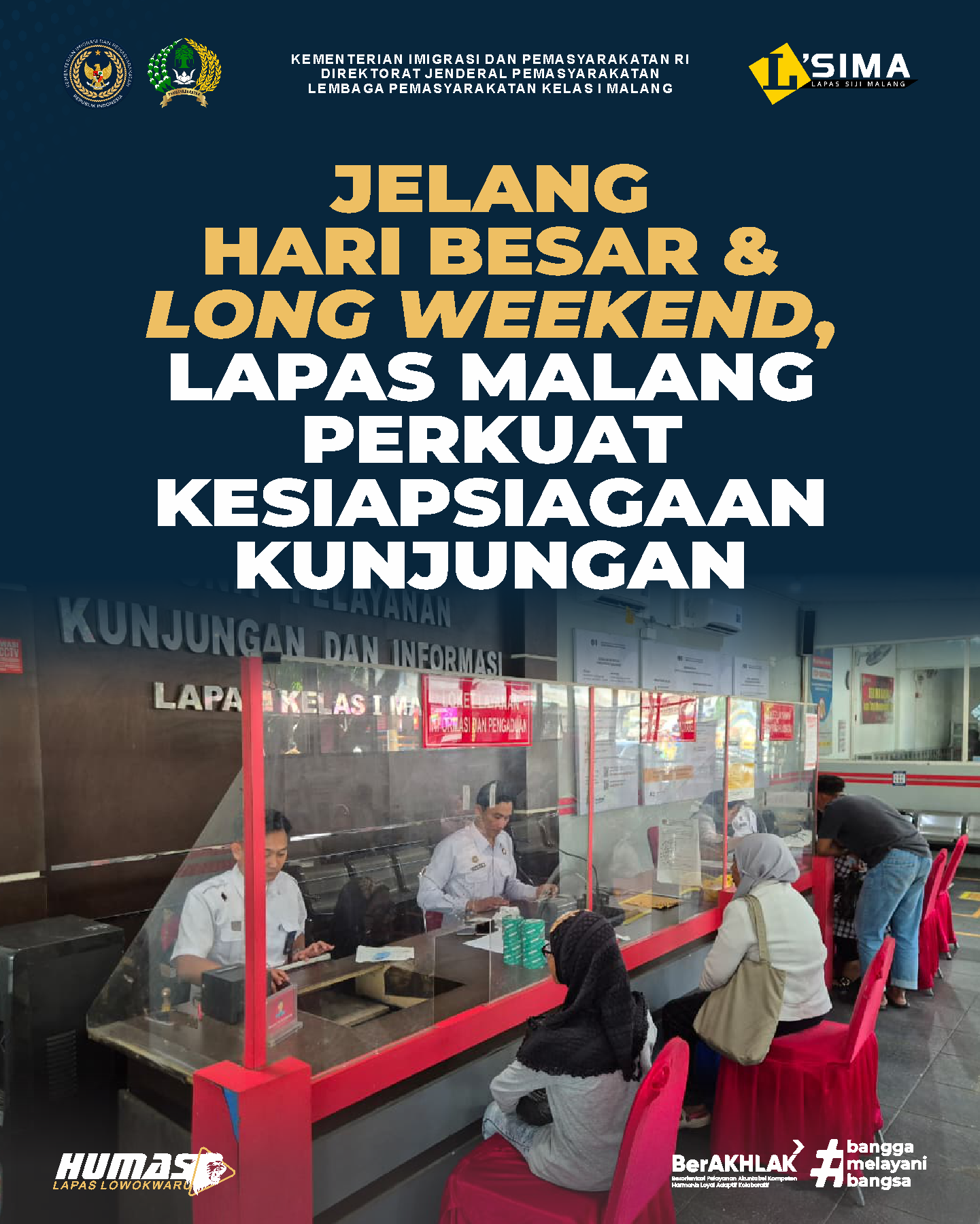 Malang – Lembaga Pemasyarakatan Kelas I Malang melaksanakan penguatan kesiapsiagaan layanan dan pengamanan kunjungan menjelang momentum hari besar,...