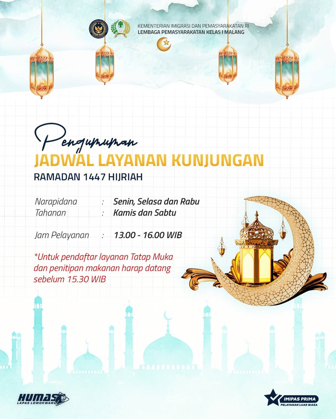 Kami beritahukan perubahan jadwal layanan kunjungan warga binaan selama bulan Ramadan 2026.