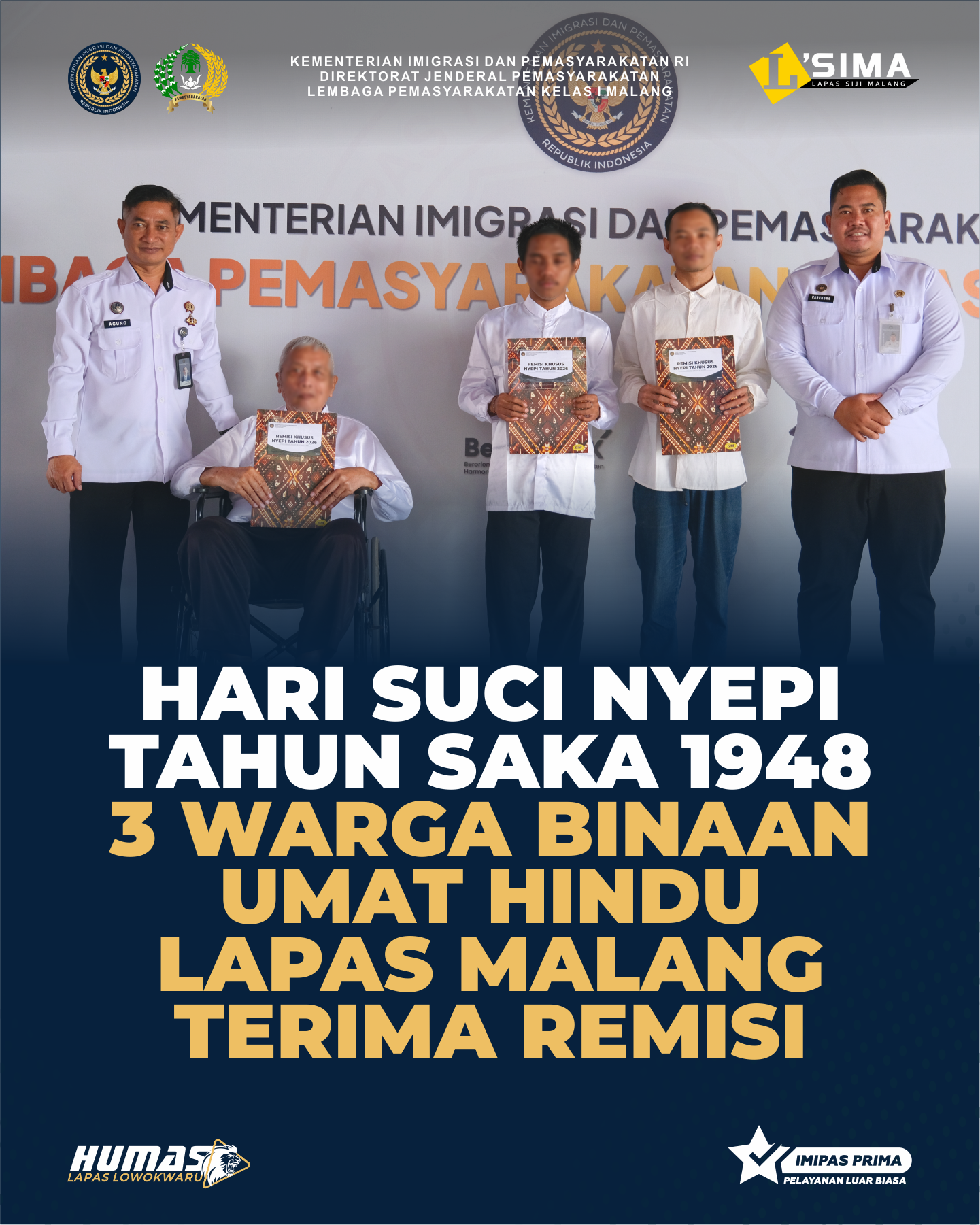 Malang - Lapas Kelas I Malang melaksanakan penyerahan Remisi Khusus (RK) Hari Raya Nyepi Tahun 2026 kepada warga binaan yang...