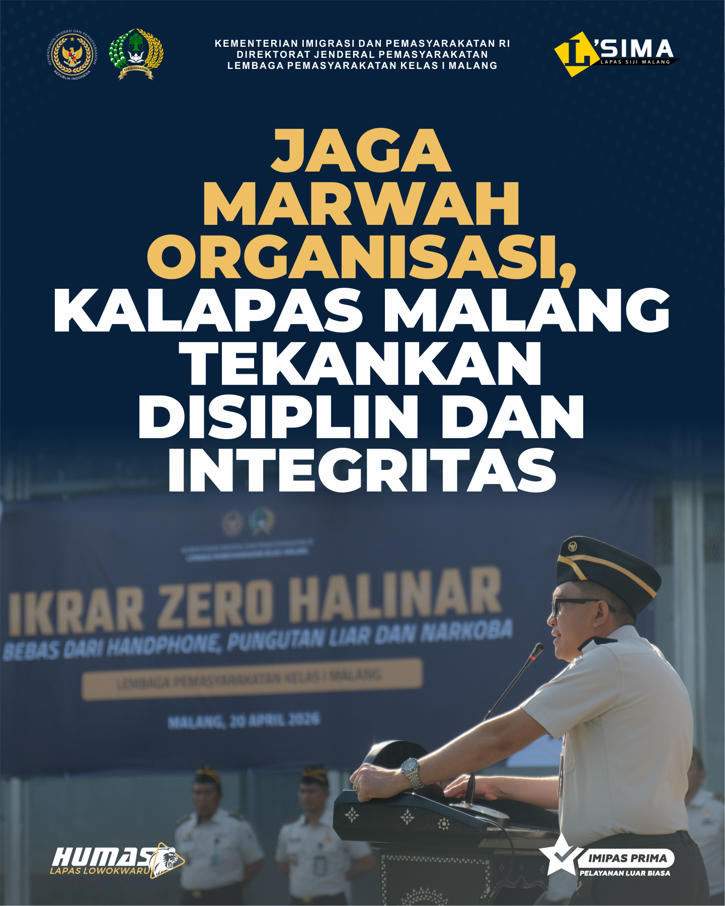 Malang - Lapas Kelas I Malang menggelar apel ikrar komitmen Zero HALINAR yang diikuti oleh seluruh jajaran pejabat dan petugas, baik staf maupun regu pengamanan Senin pagi(20/04) . Kegiatan tersebut juga melibatkan CASN Pemasyarakatan, peserta magang Kementerian Ketenagakerjaan, serta mahasiswa yang sedang menjalani praktik kerja. Bertempat di Lapangan Senopati, apel dipimpin langsung oleh Kalapas Malang, Christo Victor Nixon Toar. Dalam pelaksanaannya, beliau membacakan ikrar yang kemudian diikuti secara serentak oleh seluruh peserta dengan penuh khidmat. Momentum ini menjadi penguatan komitmen bersama dalam menjaga lingkungan Lapas tetap bersih dari narkoba, handphone ilegal, dan pungutan liar. Selain sebagai simbol, ikrar ini juga menjadi pengingat akan tanggung jawab moral seluruh petugas Pemasyarakatan.