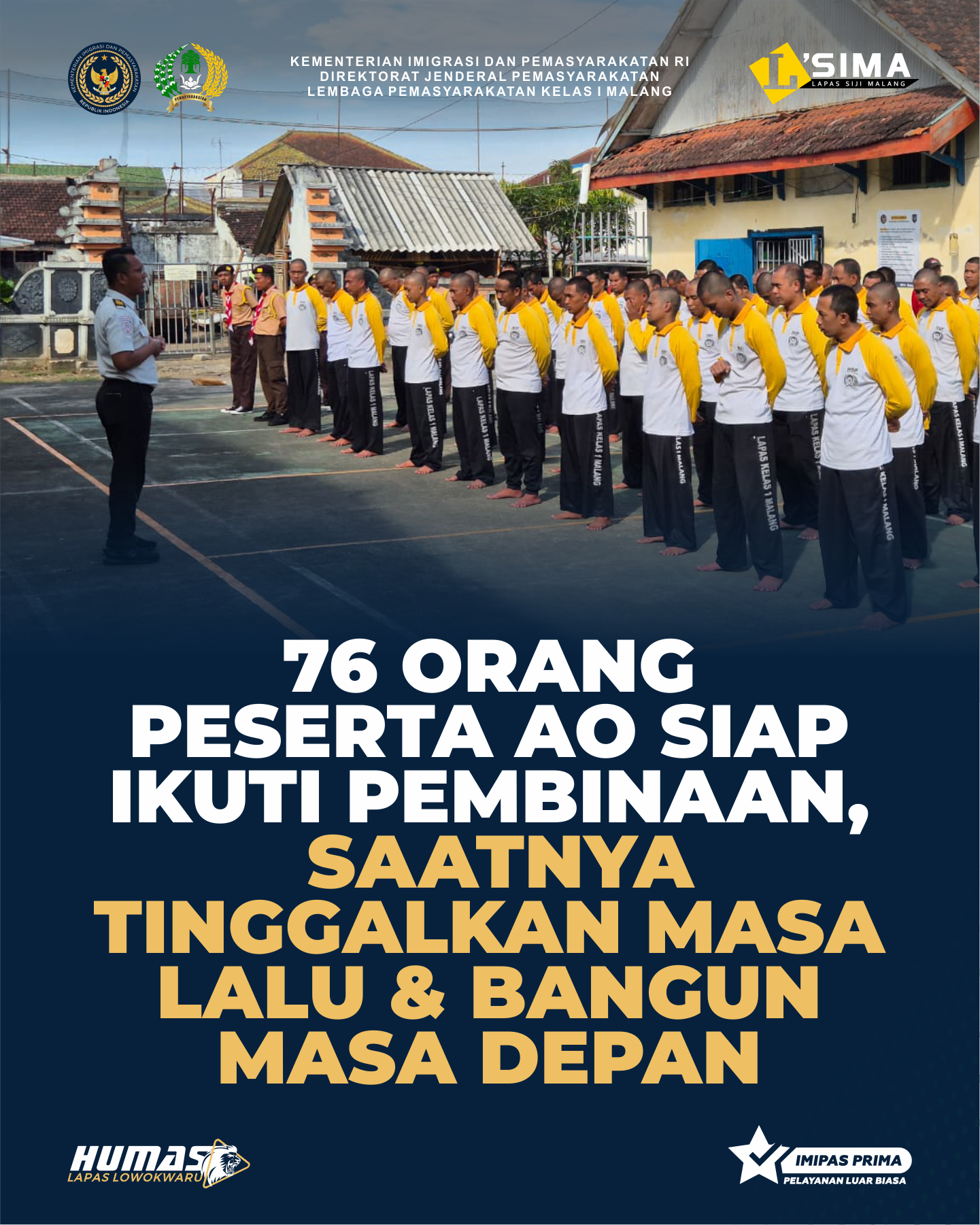 Malang – Dalam rangka pembinaan awal bagi warga binaan, Lapas Kelas I Malang kembali melaksanakan kegiatan Admisi Orientasi (AO) bagi tahanan yang telah berkekuatan hukum tetap (inkrah) dan resmi berstatus sebagai narapidana. Pada hari ini(28/04), AO Angkatan 216 diikuti oleh sebanyak 76 orang peserta yang akan menjalani proses pengenalan lingkungan sekaligus pembentukan karakter awal. Kegiatan ini menjadi tahapan penting dalam menentukan arah pembinaan ke depan, baik dari sisi kepribadian maupun kemandirian. Dalam pelaksanaannya, peserta AO mendapatkan pengarahan langsung dari Pembina Keamanan Pemasyarakatan Ahli Muda, M. Faishol Nur. Beliau didampingi oleh jajaran staf Administrasi Keamanan dan Tata Tertib serta petugas pembina AO yang turut memberikan pemahaman terkait tata tertib kehidupan di dalam lapas.