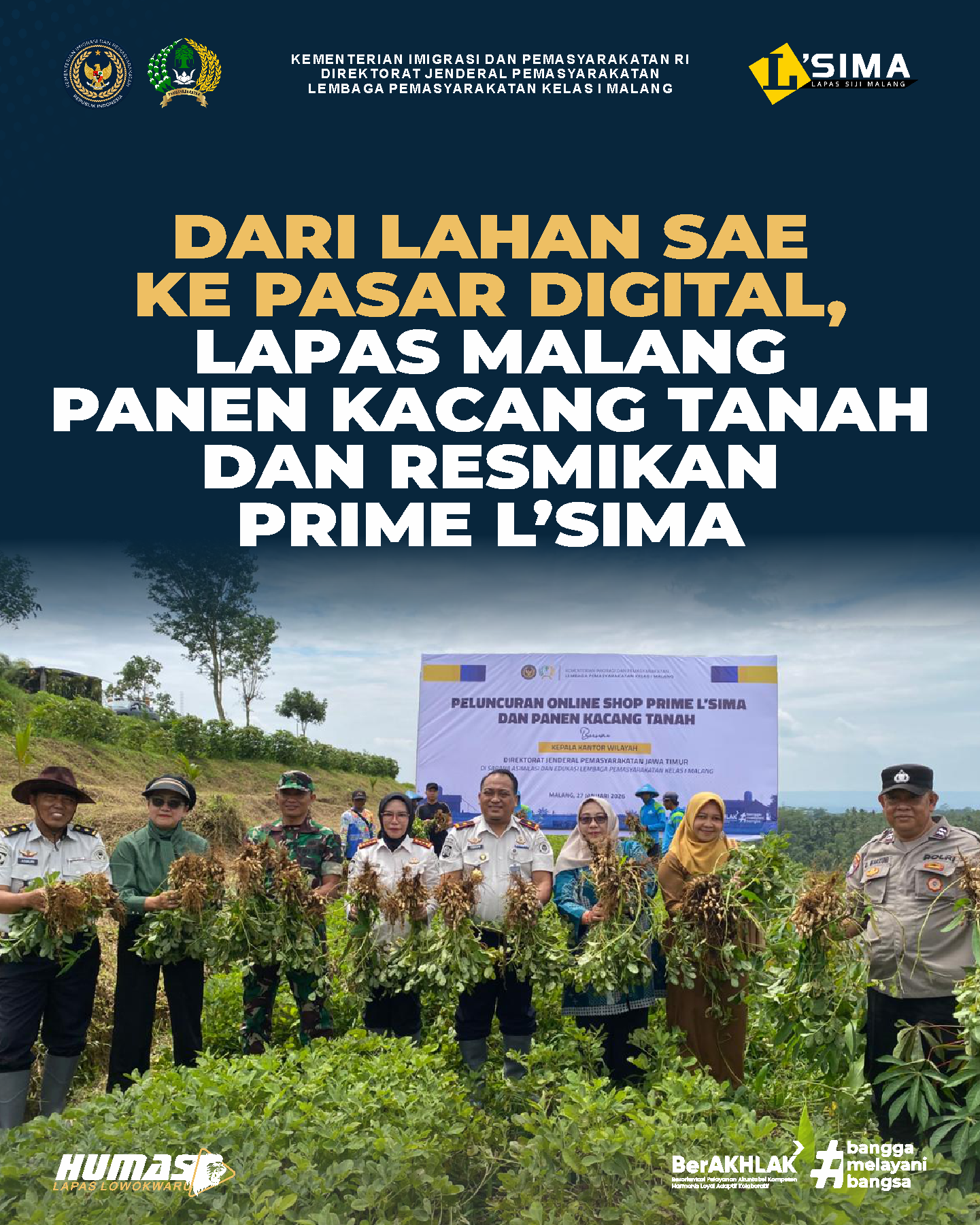 Malang - Kegiatan panen kacang tanah sekaligus peluncuran online shop Prime L’Sima dilaksanakan di Sarana Asimilasi dan Edukasi (SAE) Lapas Kelas I Malang yang berlokasi di Kecamatan Ngajum, Selasa (27/01). Kegiatan ini merupakan bagian dari penguatan program pembinaan kemandirian berbasis pertanian yang terus dikembangkan Lapas Kelas I Malang. Acara dipimpin langsung oleh Kepala Lapas Kelas I Malang, Teguh Pamuji, serta turut dihadiri Kepala Lapas Perempuan Malang, Endang Margiati. Momentum ini menjadi wujud sinergi antara pemasyarakatan dengan berbagai pihak terkait. Panen dilakukan sebagai bentuk optimalisasi lahan produktif yang dikelola secara berkelanjutan.