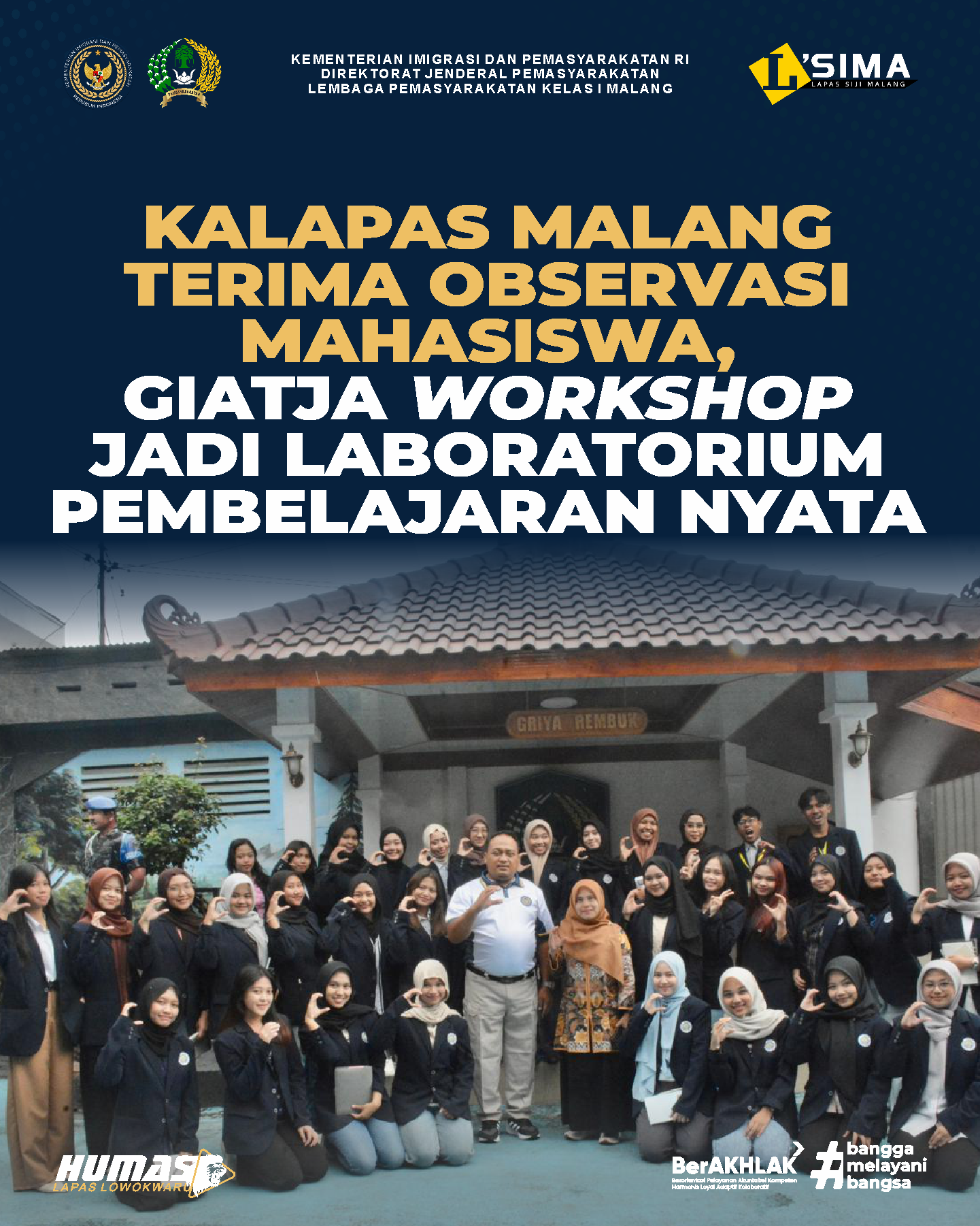 Malang - Lembaga Pemasyarakatan Kelas I Malang menerima kunjungan mahasiswa dari Universitas Negeri Malang, khususnya Fakultas Ilmu Pendidikan, dalam rangka pelaksanaan observasi mata kuliah Identifikasi Kebutuhan Belajar Masyarakat(13/02). Kegiatan tersebut diterima langsung oleh Kalapas Malang, Teguh Pamuji, di lingkungan Lembaga Pemasyarakatan Kelas I Malang. Rombongan mahasiswa terlebih dahulu diajak meninjau Unit Pembinaan Kemandirian untuk melihat secara langsung berbagai program kerja warga binaan. Mulai dari produksi batik, budidaya ikan lele dan koi, hingga budidaya jamur, seluruhnya diperkenalkan sebagai bagian dari pembinaan berbasis keterampilan. Mahasiswa tampak antusias mencatat informasi serta berdialog langsung dengan warga binaan yang bekerja di giatja workshop.