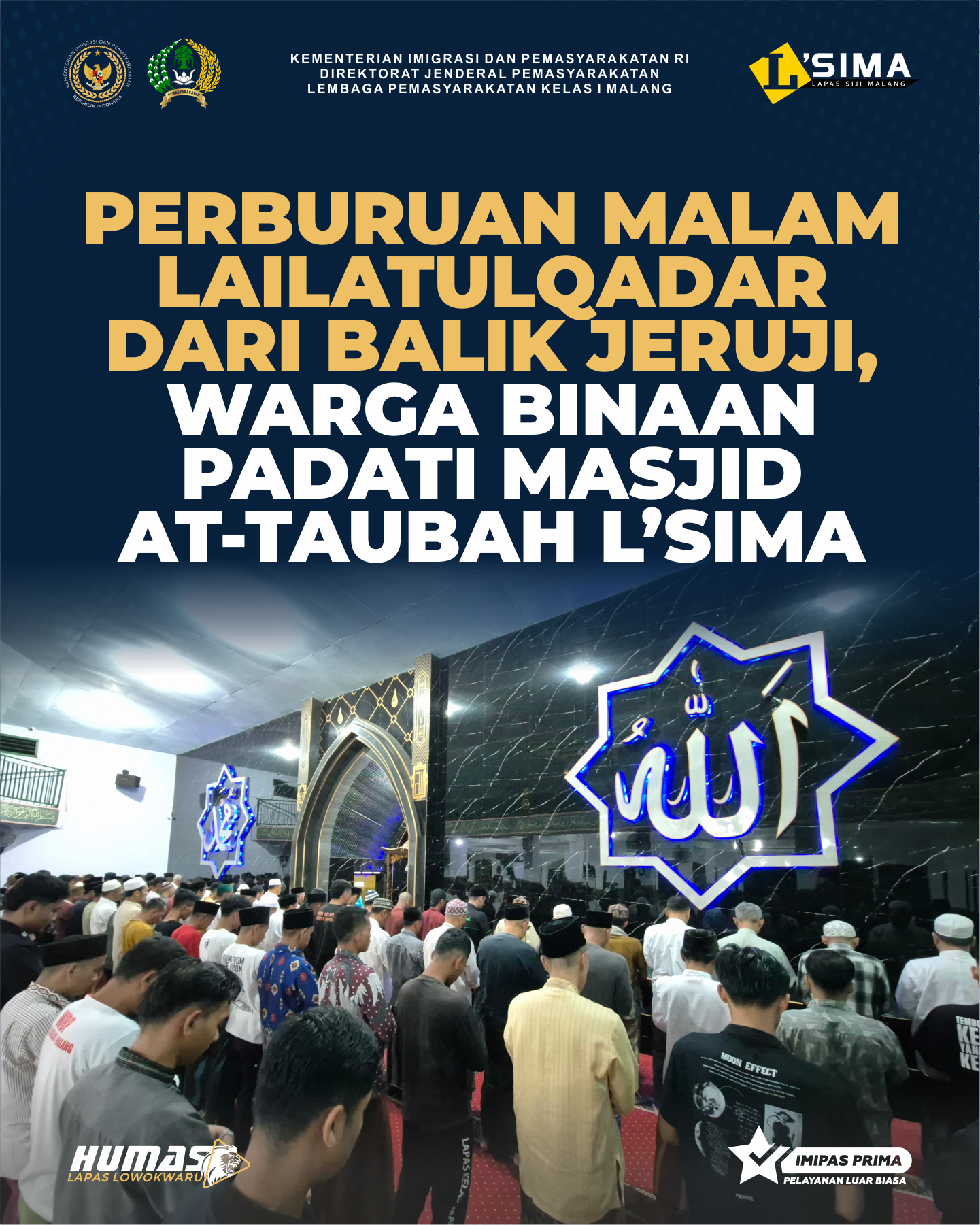 Malang – Memasuki sepuluh malam terakhir bulan Ramadan, suasana religius semakin terasa di Lapas Kelas I Malang. Warga binaan tampak memadati Masjid At-Taubah untuk menunaikan rangkaian ibadah malam mulai dari salat tarawih, salat sunnah, hingga tadarus Al-Qur’an(12/03). Kegiatan ini menjadi bagian dari upaya warga binaan dalam memburu keberkahan malam Lailat Al-Qodar atau Lailatulqadar yang diyakini lebih baik dari seribu bulan. Dengan penuh kekhusyukan, mereka memanfaatkan waktu malam Ramadan untuk memperbanyak ibadah dan mendekatkan diri kepada Allah SWT. Petugas pengamanan dan pembinaan turut mendampingi jalannya kegiatan agar ibadah berlangsung tertib dan khidmat. Semangat spiritual yang tercermin dari antusiasme warga binaan ini menjadi gambaran kuatnya pembinaan kepribadian di Lapas Malang.