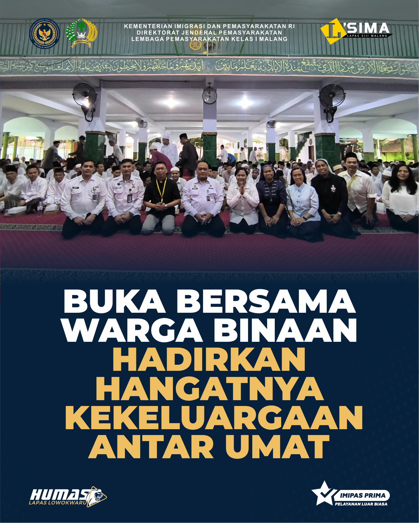 Malang - Lapas Kelas I Malang menerima kunjungan dari Gereja Katolik Paroki Maria Diangkat ke Surga dalam rangka kegiatan buka puasa bersama dengan warga binaan, Rabu (12/03). Kegiatan yang berlangsung di lingkungan Lapas Malang ini dihadir langsung oleh Kalapas Malang Teguh Pamuji beserta jajaran pejabat struktural serta perwakilan dari pihak gereia. Suasana hangat dan penuh kekeluargaan terasa sejak awal kegiatan yang diikuti oleh warga binaan beragama Islam. Momentum ini menjad wuiud nvata kebersamaan dan toleransi antarumat beragama di lingkungan Pemasyarakatan. Selain sebagai kegiatan berbagi di bulan Ramadan, acara ini juga dimaksudkan untuk mempererat hubungan kemanusiaan tanpa memandang perbedaan keyakinan.