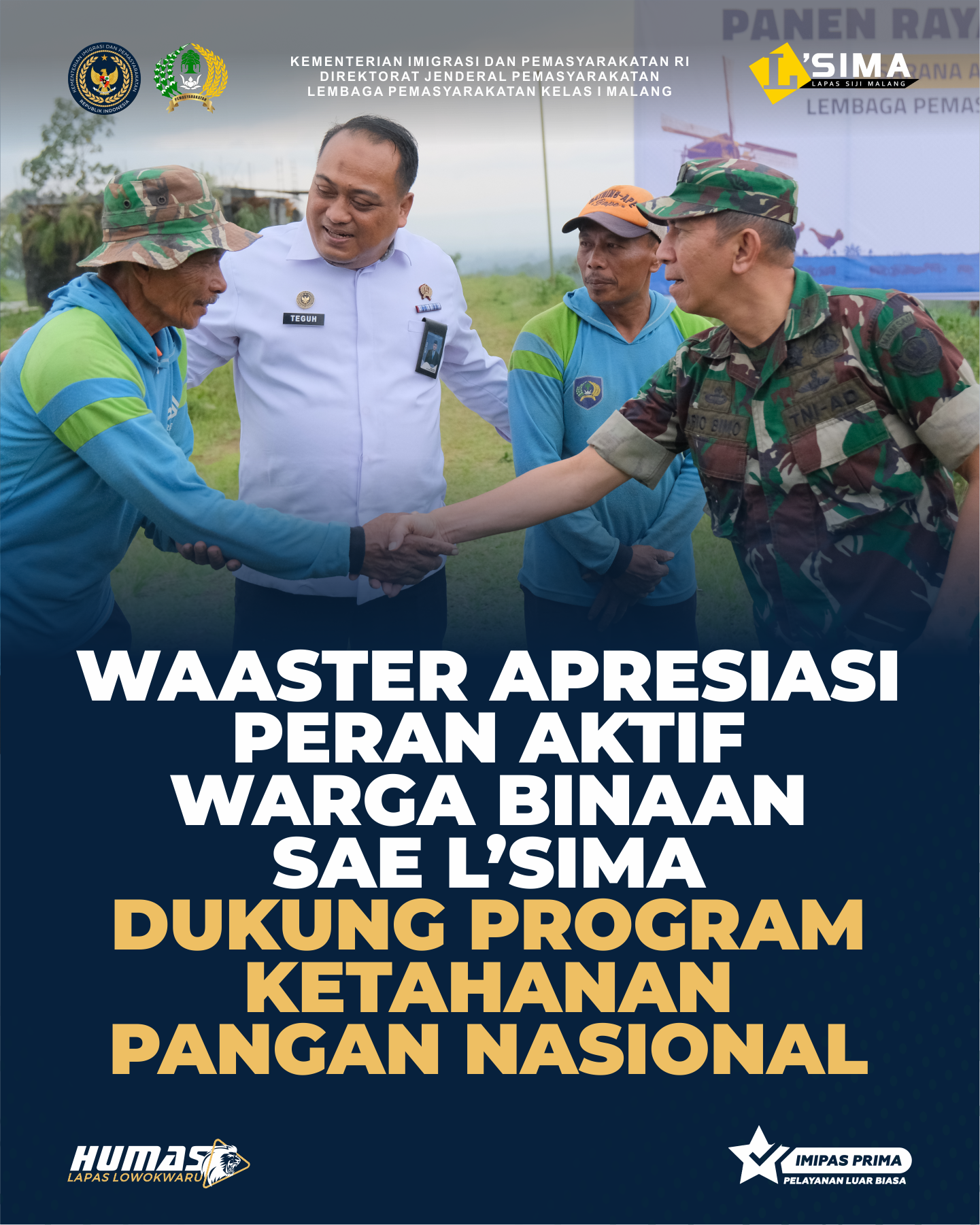 Malang - Rangkaian kegiatan diseminasi penataan lingkungan hidup di SAE L’SIMA Ngajum yang diawali dengan apel dan dilanjutkan penanaman 250 pohon berlangsung penuh semangat dan kolaborasi lintas instansi(26/03). Kegiatan tersebut menjadi wujud nyata sinergi TNI dan Lapas Malang dalam mendukung mitigasi bencana dan pelestarian lingkungan. Usai penanaman pohon, kegiatan dilanjutkan dengan panen simbolis kacang tanah sebagai bagian dari program ketahanan pangan SAE. Momentum ini tidak hanya menunjukkan keberhasilan pengelolaan lahan, tetapi juga hasil pembinaan kemandirian warga binaan. Dalam suasana penuh kehangatan, Waaster Kasad Bidang Binter Brigjen TNI Boemi Ario Bimo bersama Kalapas Malang, Teguh Pamuji, turut meninjau langsung area pertanian. Interaksi langsung pun terjalin antara pimpinan dengan warga binaan yang terlibat aktif dalam kegiatan tersebut.