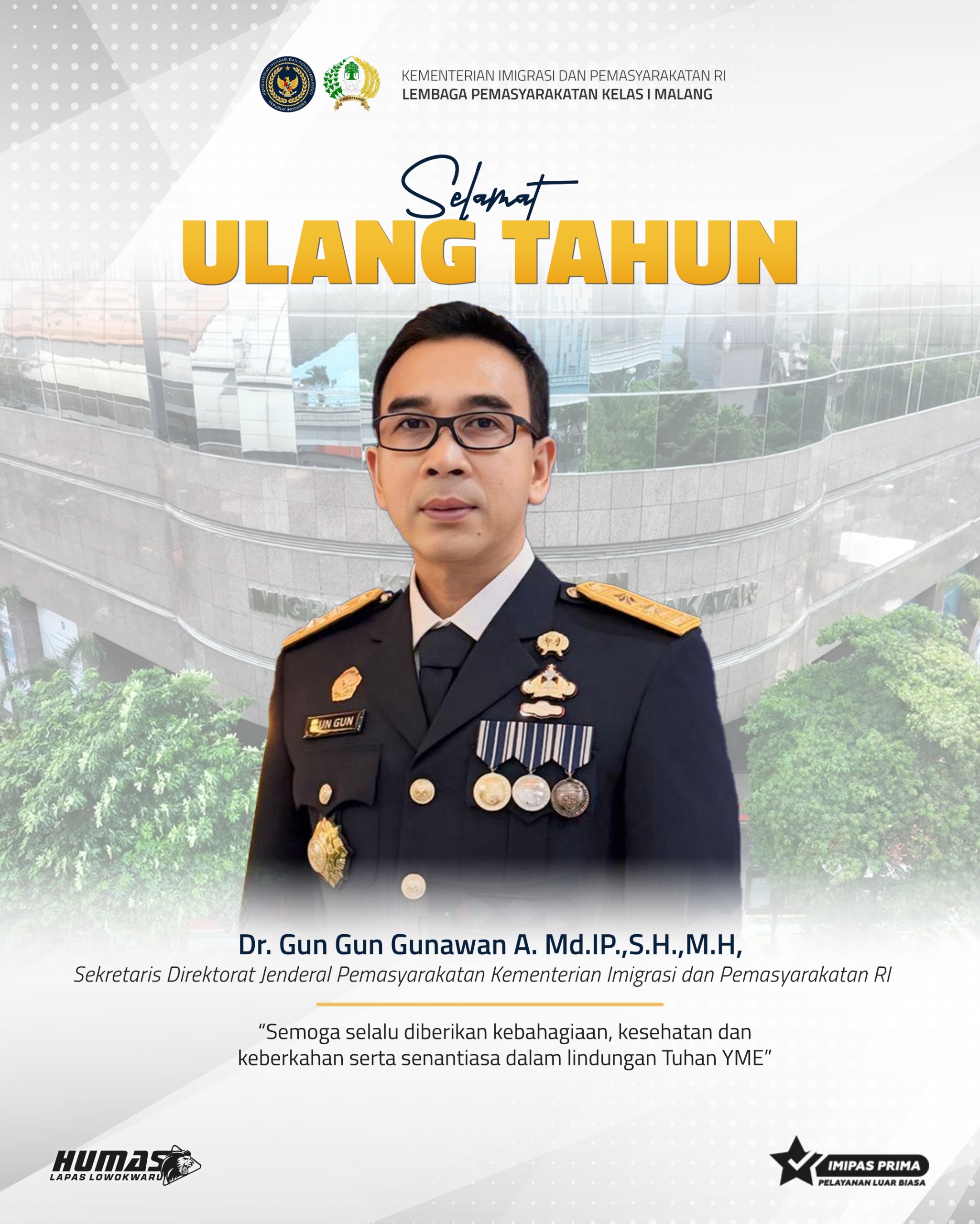 Keluarga besar L'SIMA mengucapkan, Selamat ulang tahun Dr. Gun Gun Gunawan, A.Md.IP., S.H., M.H. Bapak Sekretaris Direktorat Jenderal Pemasyarakatan Kementerian Imigrasi dan Pemasyarakatan RI ke-53.