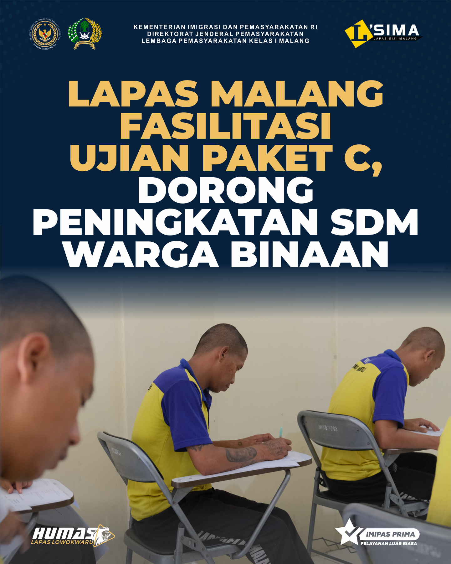 Malang – Lapas Kelas I Malang menggelar Ujian Sumatif Akhir Semester Genap Program Pendidikan Kesetaraan Paket C kelas XII bekerja sama dengan Dinas Pendidikan dan Kebudayaan Kota Malang melalui SPNF SKB Kota Malang(30/03). Kegiatan ini berlangsung selama empat hari, mulai 30 Maret hingga 2 April 2026, dengan diikuti oleh 14 warga binaan sebagai peserta didik. Pelaksanaan ujian menjadi bagian dari komitmen Lapas Malang dalam memenuhi hak pendidikan bagi warga binaan. Program kesetaraan Paket C ini setara dengan jenjang pendidikan SMA, sehingga diharapkan mampu meningkatkan kompetensi dan peluang reintegrasi sosial. Ujian dilaksanakan dengan tertib dan sesuai prosedur yang telah ditetapkan oleh penyelenggara pendidikan. Seluruh peserta mengikuti rangkaian ujian dengan penuh kesungguhan dan disiplin.