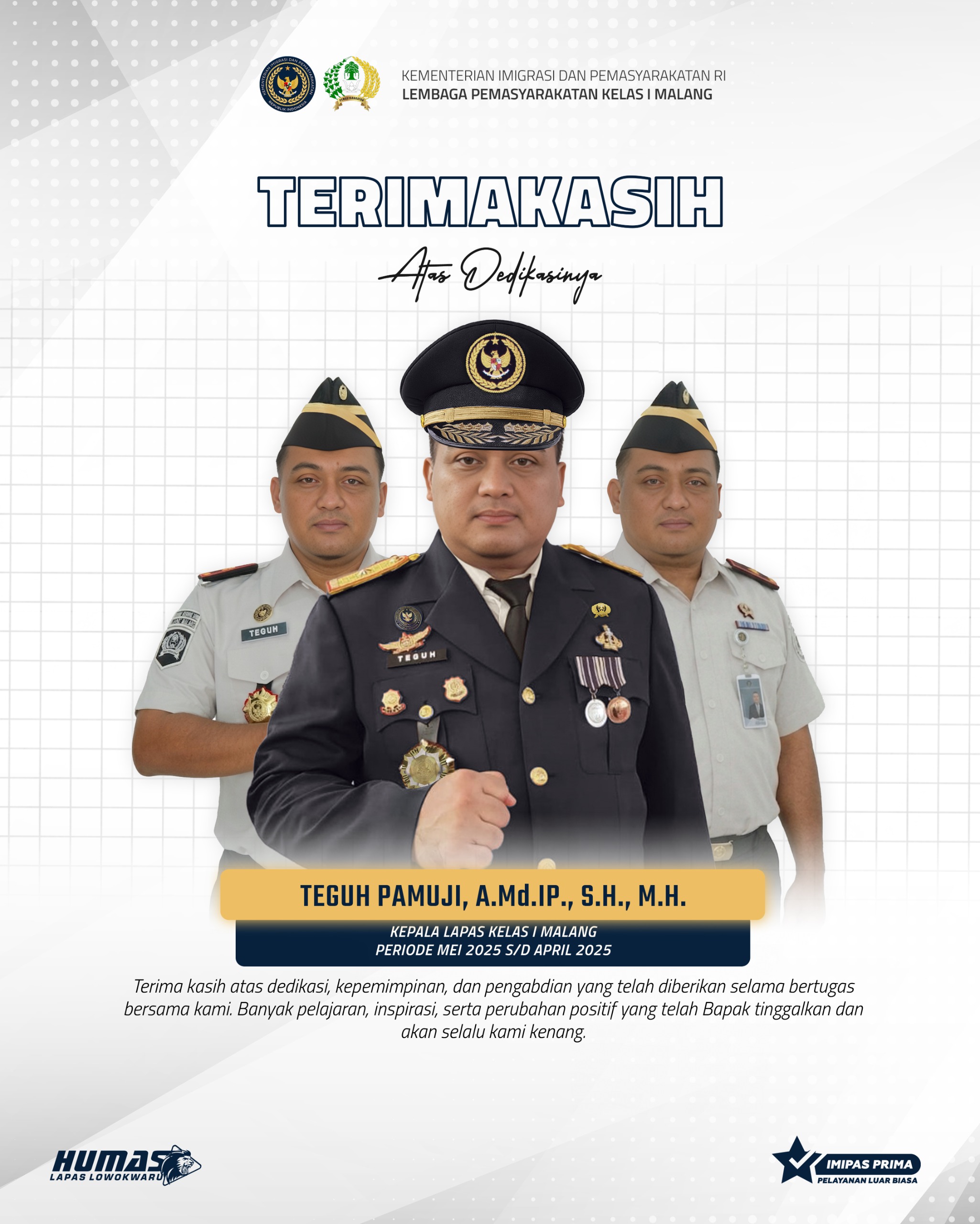 Terima kasih atas dedikasi dan pengabdian luar biasa yang telah diberikan oleh Bapak Teguh Pamuji, A.Md.IP., S.H., M.H. selama periode Mei 2025 – April 2026.
